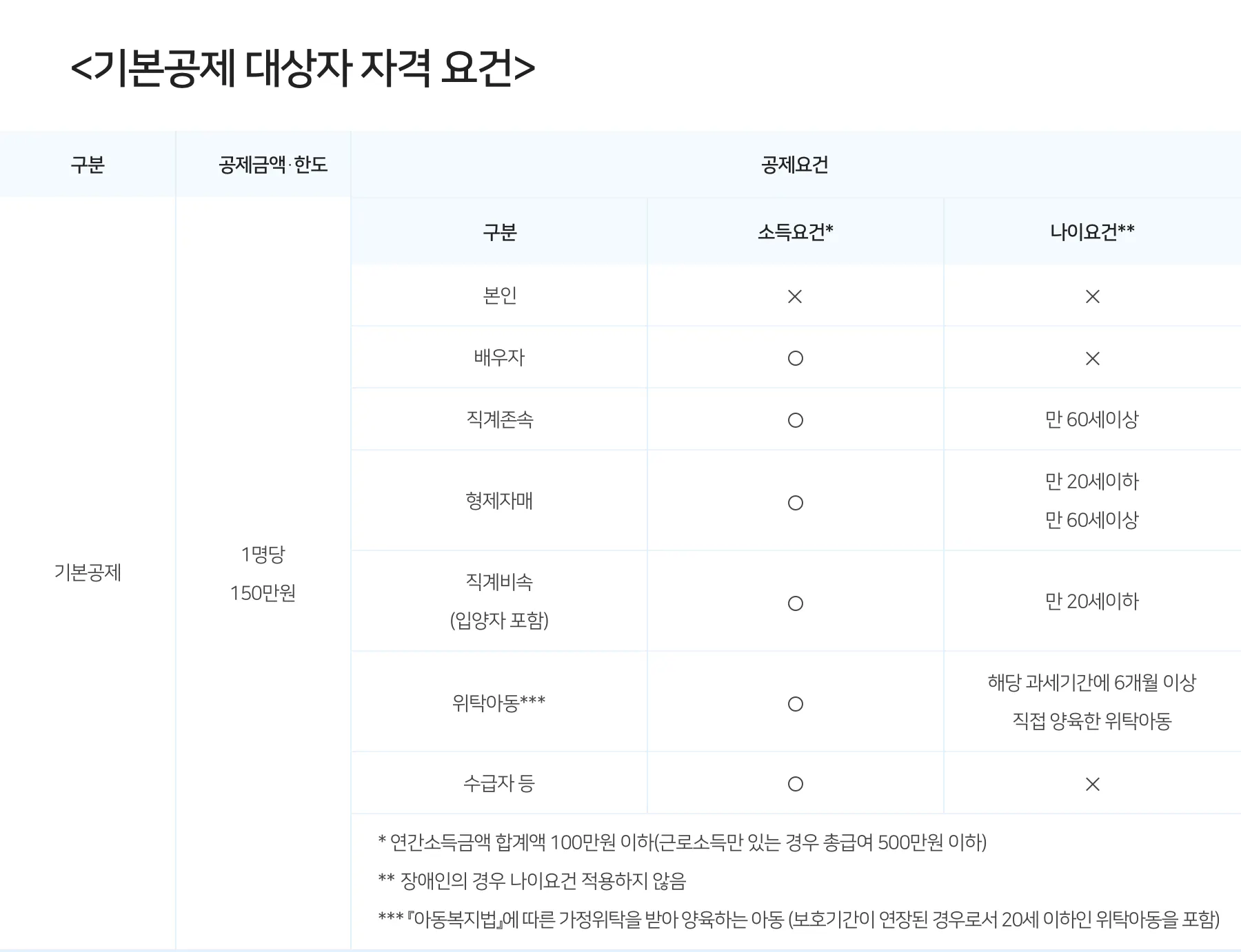 또한 공제 대상자가 장애인인 경우에는 연령을 제외한 다른 조건들이 부양가족공제 요건을 모두 충족한다면 나이와 상관없이 부양가족으로 등록해 기본공제를 받을 수 있습니다.