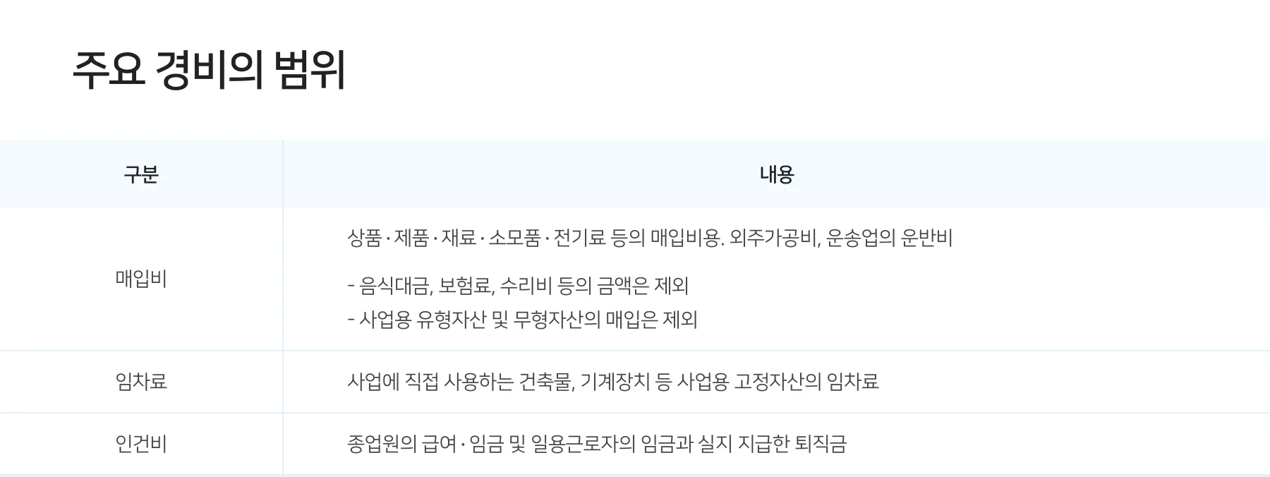 세법에 규정된 주요 경비의 범위는 아래 있는 표에 정리해뒀으니 살펴보시길 바랍니다.