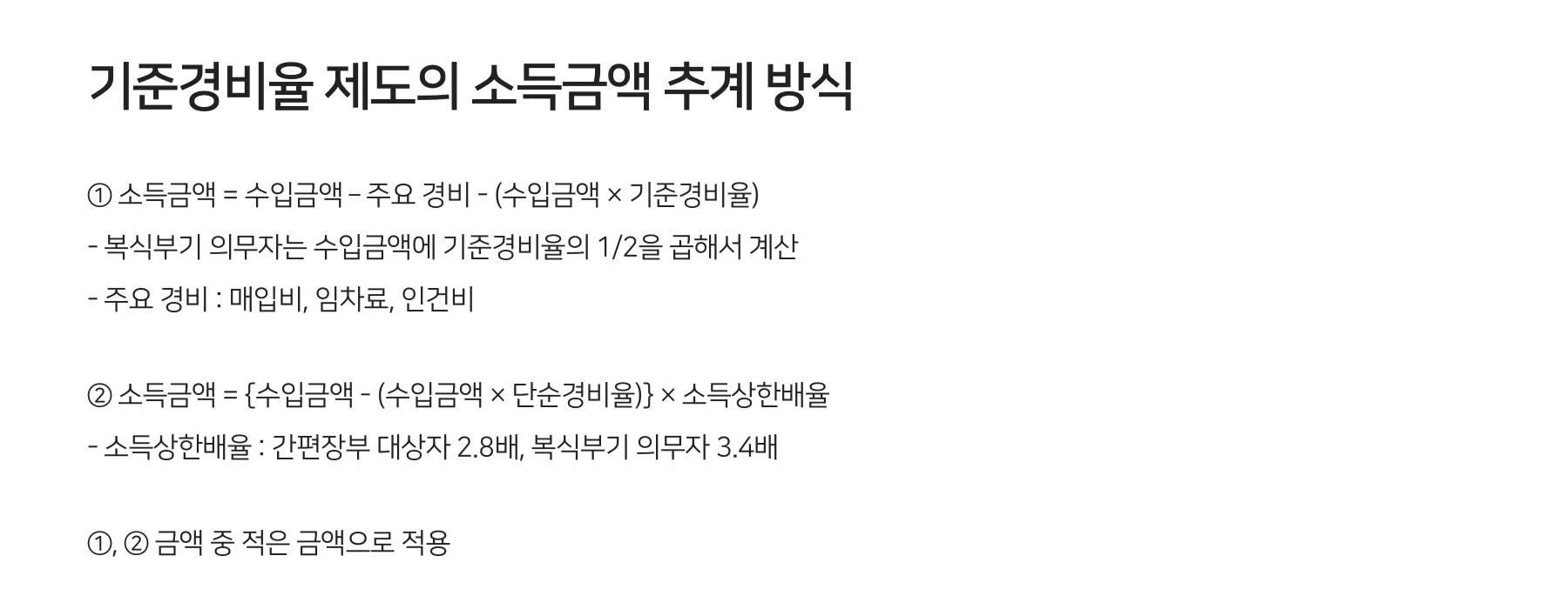 매출에서 주요 경비 차감한 뒤 기준경비율 적용해서 구한 기타 필요경비를 추가로 차감해 사업소득 구해요