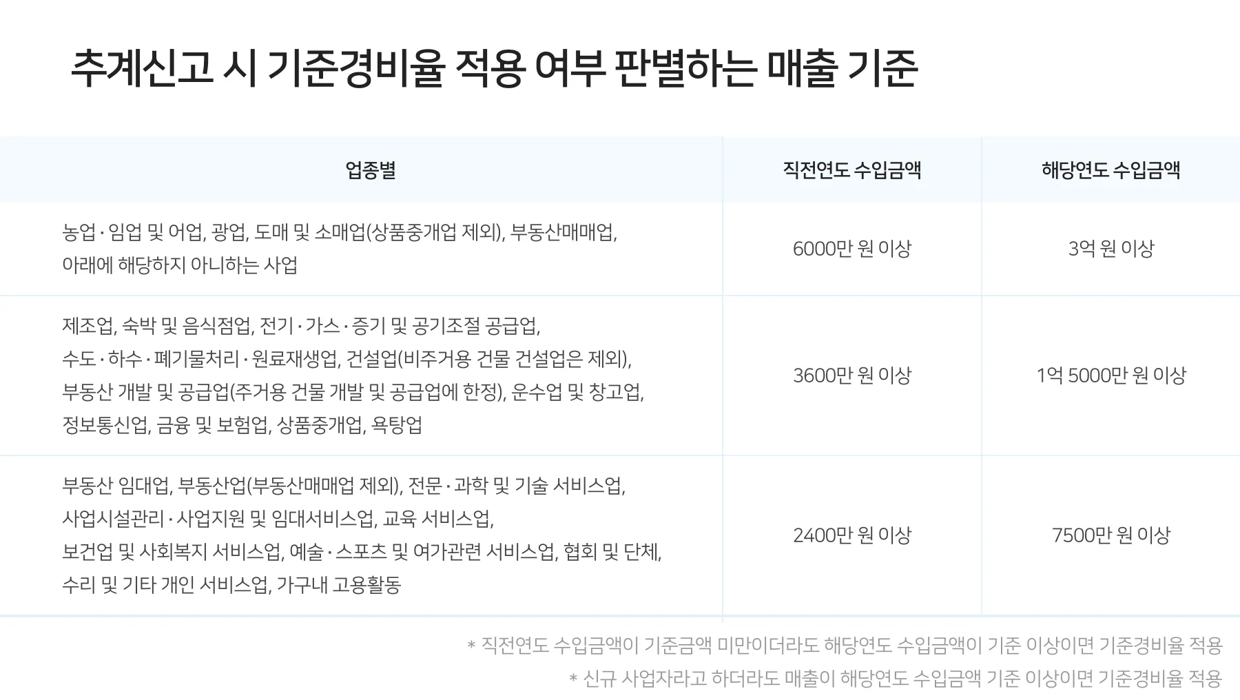 직전연도 매출과 해당연도 매출이 업종별 기준금액 이상이면 기준경비율 적용돼요