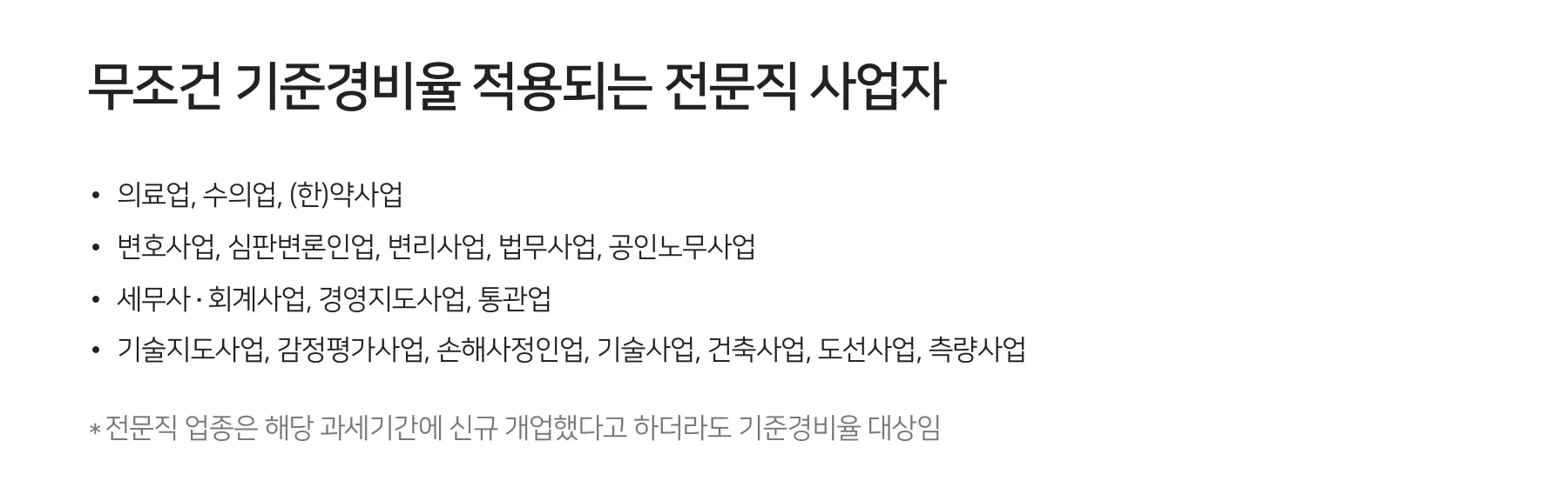 매출액, 신규 개업 여부와 상관없이 추계신고 시 무조건 기준경비율이 적용되는 업종도 있는데요. 의사, 수의사, 약사, 변호사, 변리사 등 전문직 사업자들이 이에 해당합니다.