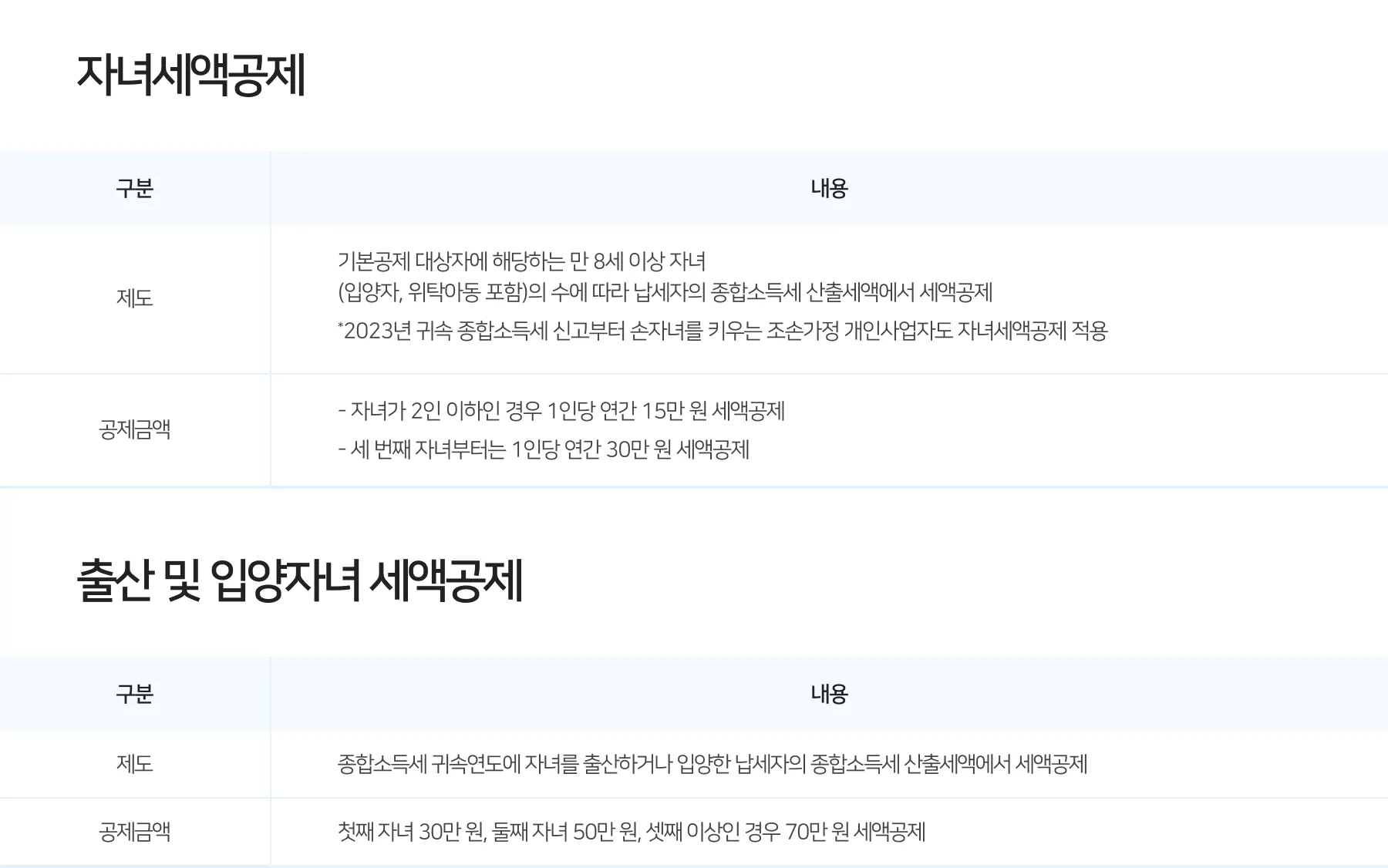 자녀세액공제와 출산‧입양자녀 세액공제 역시 근로자뿐 아니라 개인사업자들에게도 동일하게 적용되는 세액공제 항목입니다.