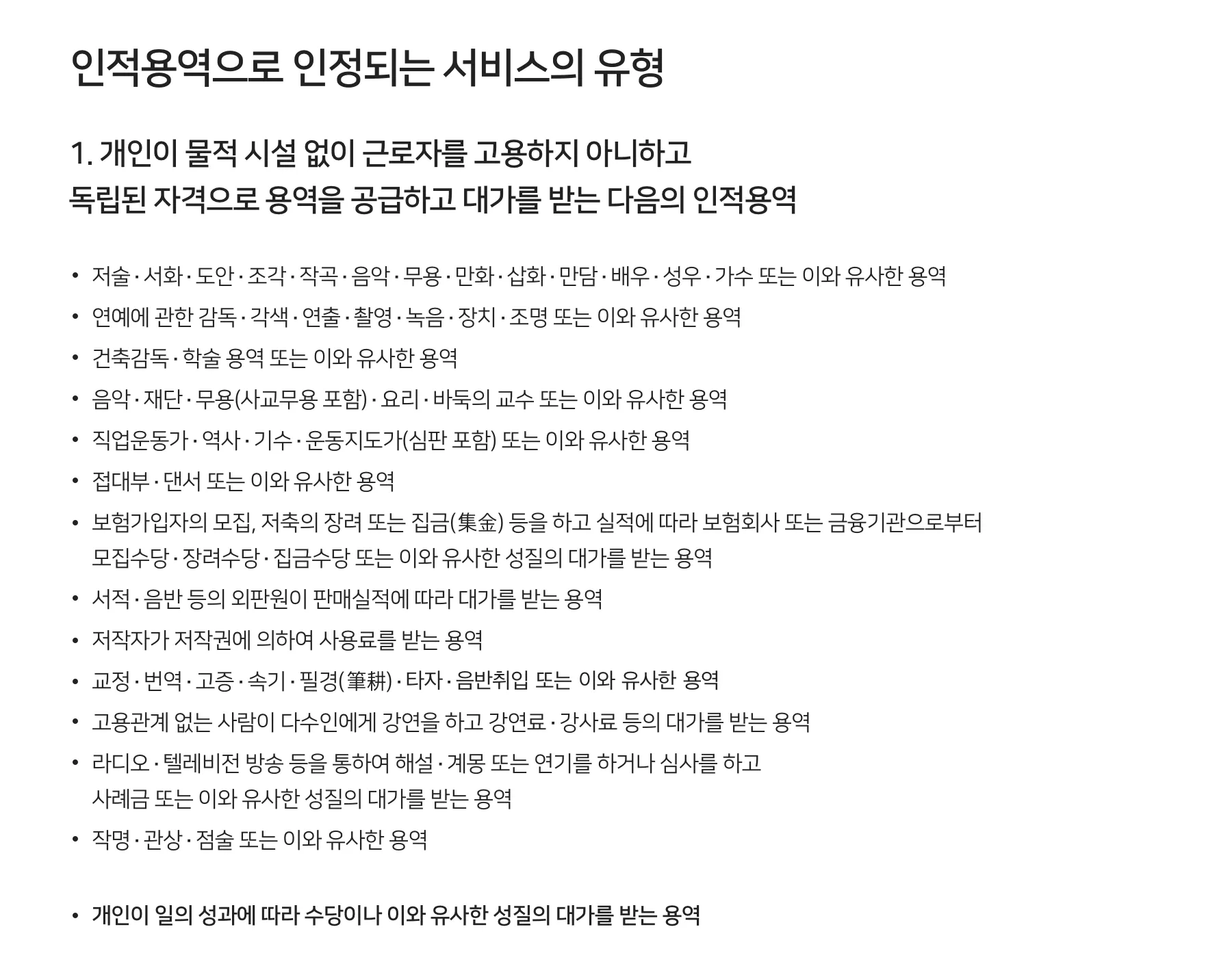 세법에서는 인적용역 사업소득의 범주에 속하는 서비스의 유형에 대해 크게 다음 두 가지로 분류하고 있는데요.