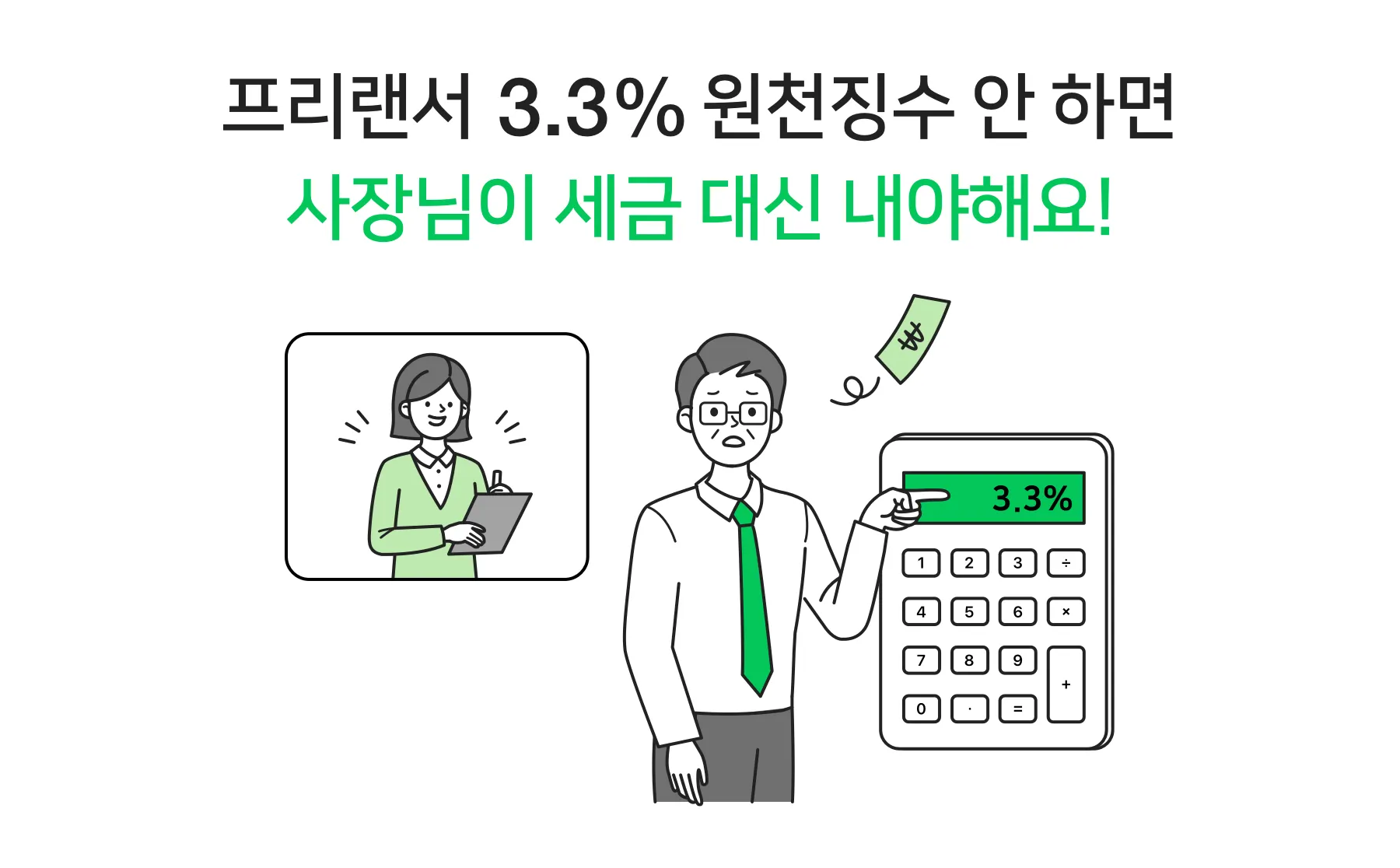 업무를 위탁받은 프리랜서가 해당 서비스를 직업적으로 반복해서 제공하는 경우에는 서비스 대금이 ‘인적용역 사업소득’으로 분류돼 대금의 3.3%(지방소득세 포함)를 원천세로 원천징수한 뒤 지급해야만 하죠.