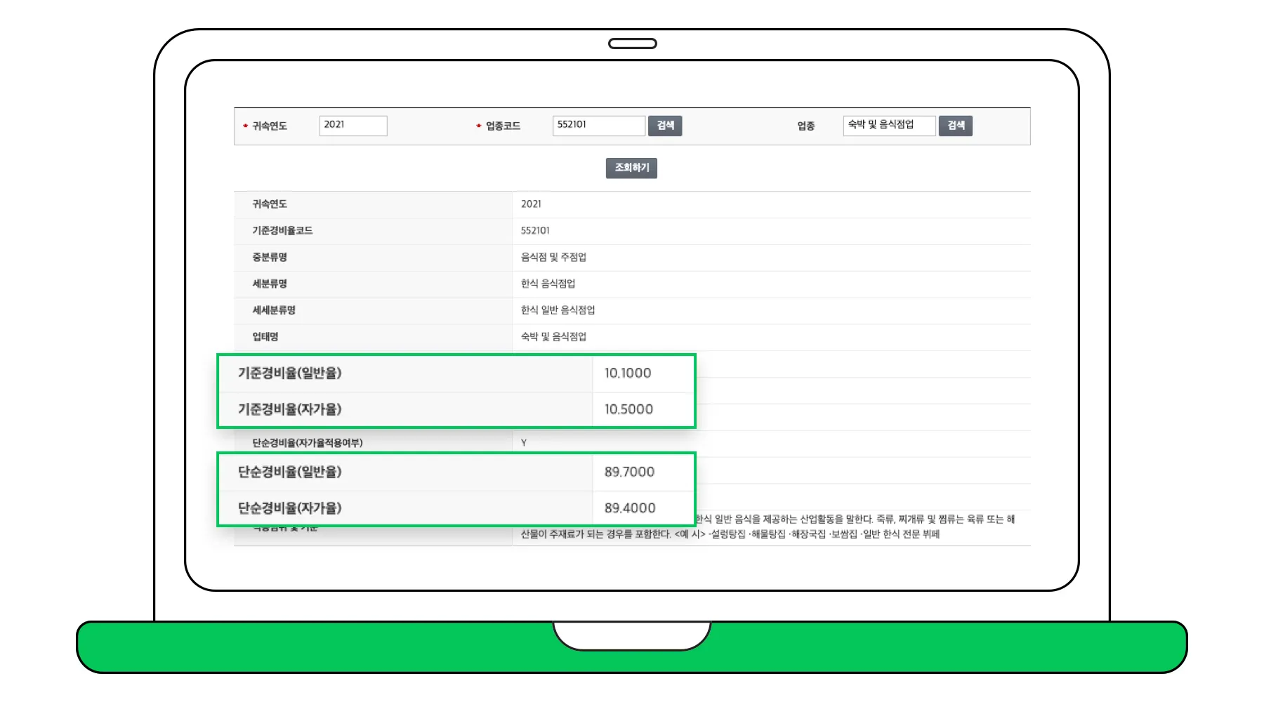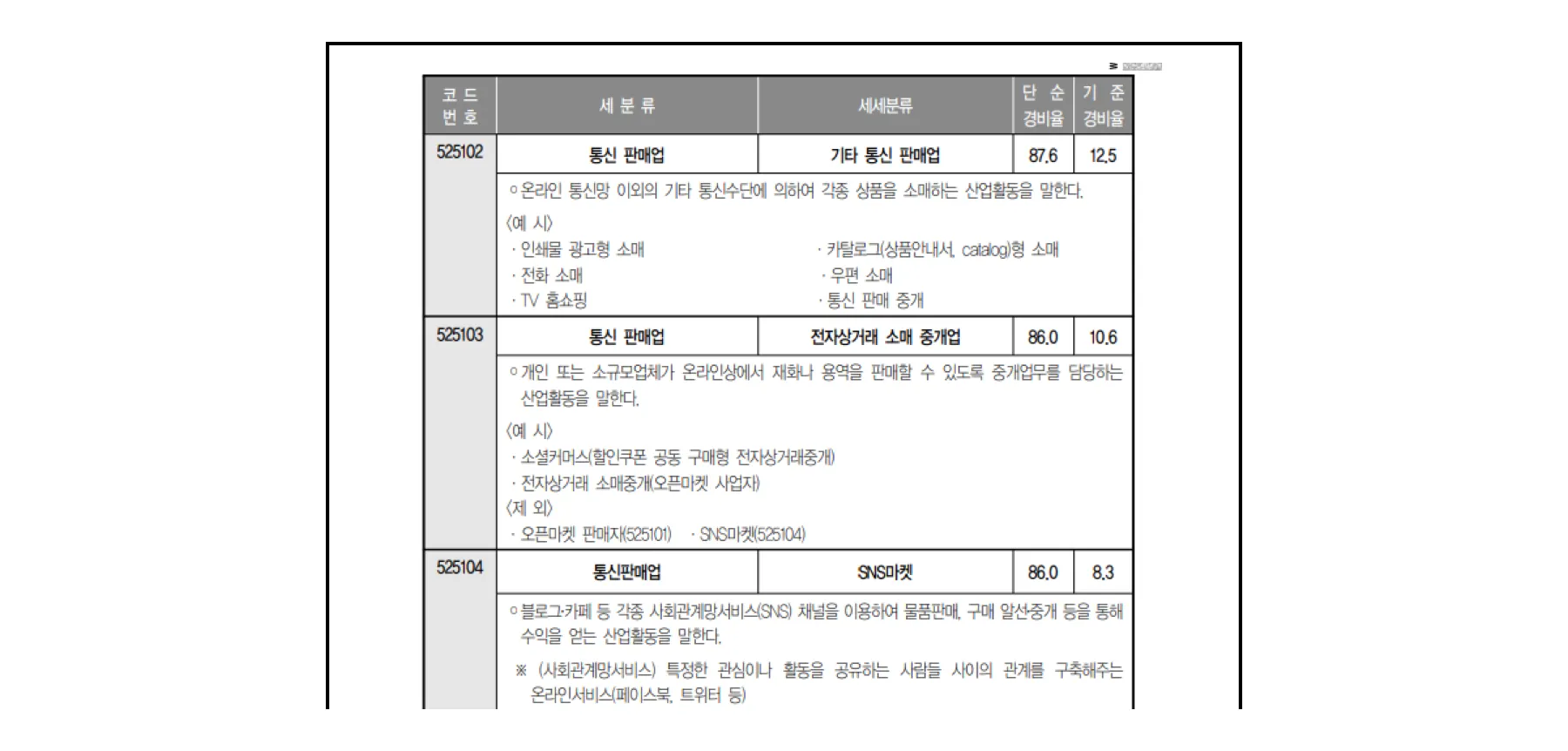 ▲ 국세청이 정해 놓은 업종별 경비율 사례 (출처: 국세청)