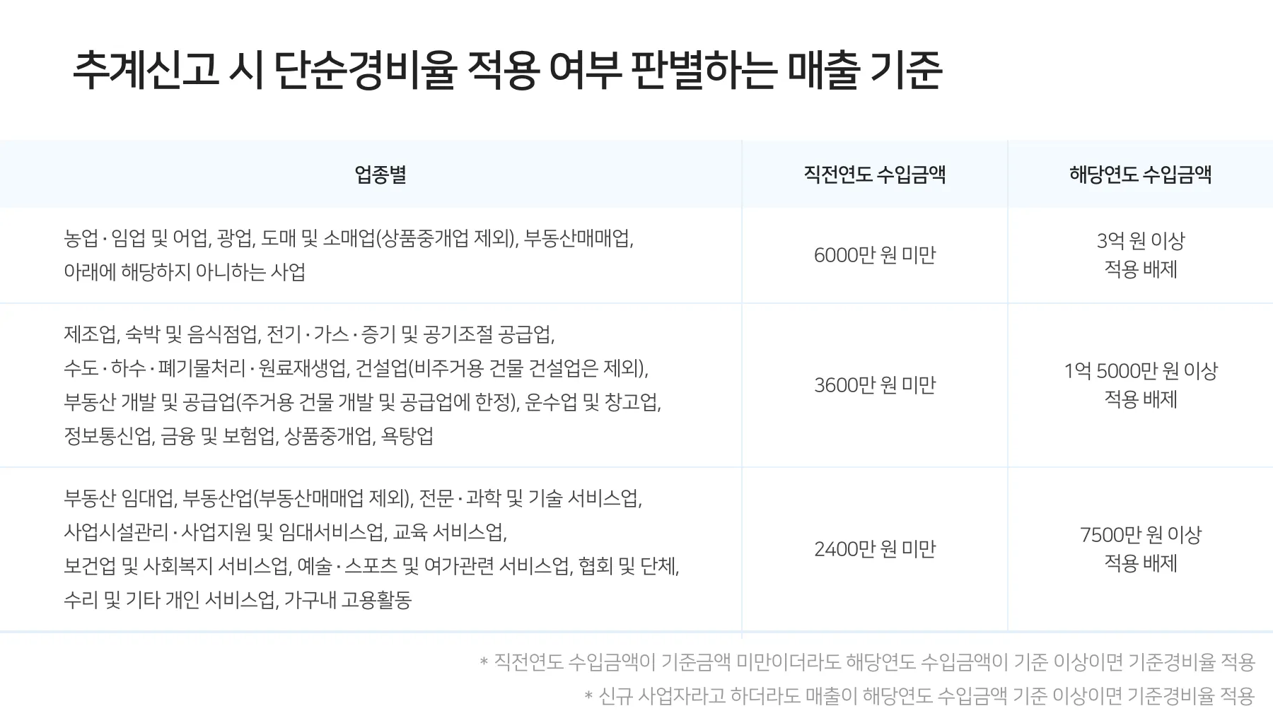 △숙박 및 음식점업 △제조업 △금융 및 보험업 △정보통신업은 직전연도 수입금액이 3600만 원 미만인 경우, 그리고 △농업·임업 및 어업 △도매 및 소매업(상품중개업 제외)과 표에 나와 있지 않은 업종들은 직전 연도 매출이 6000만 원 미만일 때만 단순경비율을 적용받을 수 있습니다.